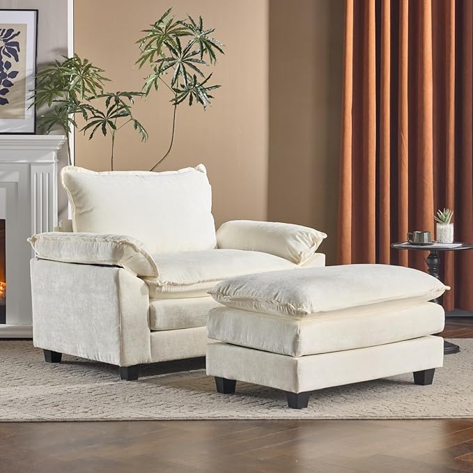 Karl home Oversized Accent Chair Chenille Sofa with Chaise, Modern Sofa Chair with Removable Ottoman Modular 1-Seater Couch and 2-Layer Ottoman for Living Room, Apartment, Studio, Beige