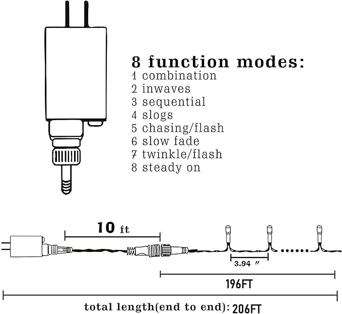 - 8 Lighting Modes and Timer: Our Halloween string lights offer 8 lighting modes, combination, in waves, sequential, slogs, chasing/flash, slow fade, twinkle/flash, and steady on, to suit various occasions. You can change the lighting modes by pressing the round button on the transformer. To set the timer (6h on/18h off), long press the round button until the green lights turn on