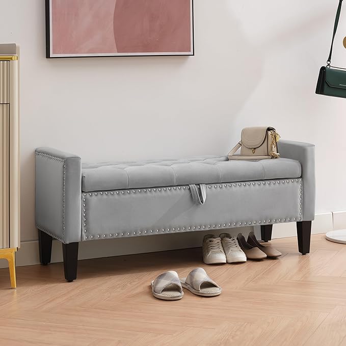 Storage Ottoman Bench, Velvet Upholstered Footstool for Bedroom and Living Room, Tufted Seat with Storage, Wooden Legs & Metal Rivets, Grey