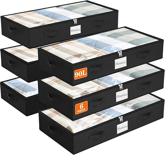 SpaceWhisper 90L Under Bed Storage Containers, 6-Pack Storage Bins with Clear Top, Foldable Closet Organizers and Storage with Label Holder for Clothing, Blankets, Comforter & Pillows(Black)