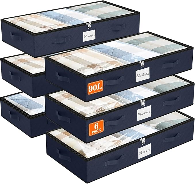 SpaceWhisper 90L Under Bed Storage Containers, 6-Pack Storage Bins with Clear Top, Foldable Closet Organizers and Storage with Label Holder for Clothing, Blankets, Comforter & Pillows(Blue)