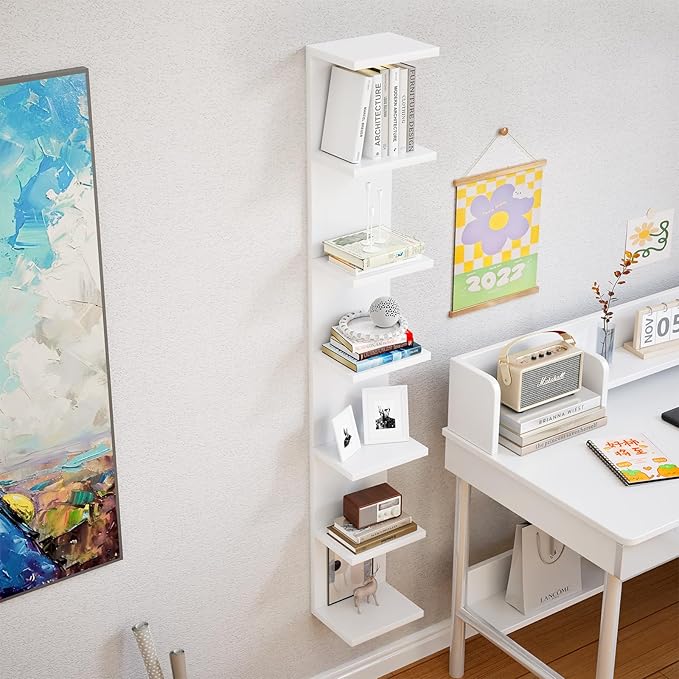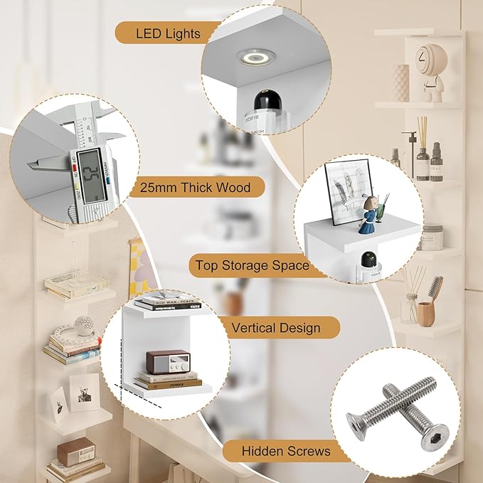 - 【Space-saving & Adjustable LED】- This 7 tier vanity shelves for wall combines functionality and modern aesthetics, vertically with the height of 6.4Ft. It perfectly adapts to long narrow spaces, creatively saves space and flexibly adapts to different items needs. The adjustable LED light strips provide a variety of colors and brightness options, allowing you to find the items you need easily in the dark, making it easy to illuminate displayed items (such as books, decor) and highlight the display effect