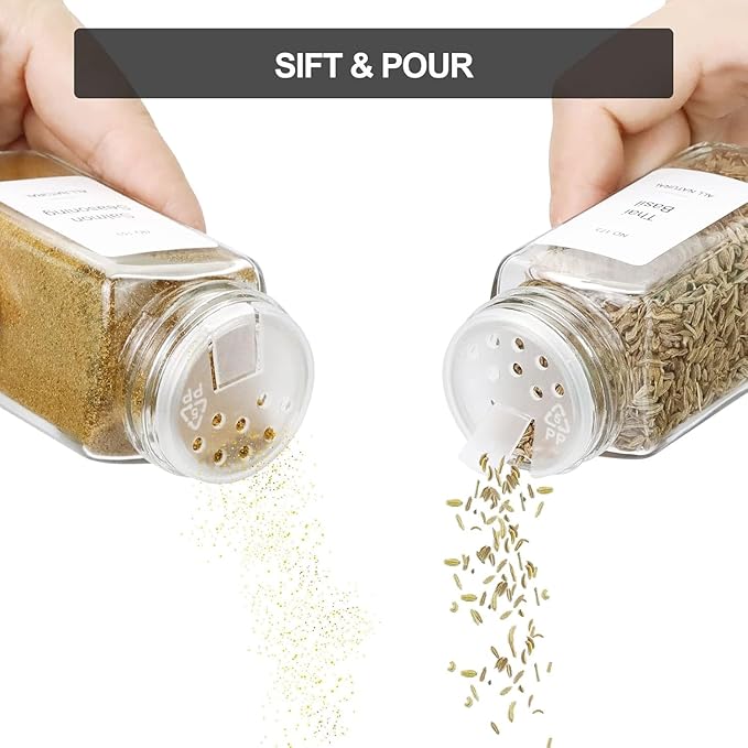 - 24 Glass Jars With Labels: Made of lead-free glass,capable of 4oz spices each; 2-in-1 shaker lid features sift and pour tops for light seasoning; 1 checklist,184 pre-printed spice labels and 32 blank labels for DIY, avoid hassle searching when labeling and cooking.