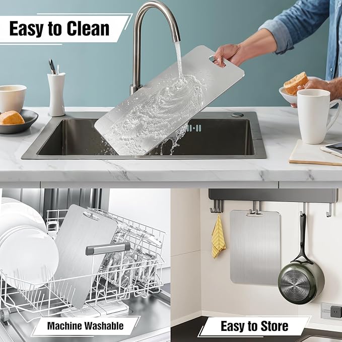 - 【Easy to Clean & Store】The smooth, non-porous surface of the titanium cutting board allows for easy cleaning, whether you're dealing with grease or food residue. Simply rinse with water or use the dishwasher for quick cleanup. Lightweight and can be hung, it doesn’t take up much kitchen space and is easy to carry for outdoor camping or RV trips.