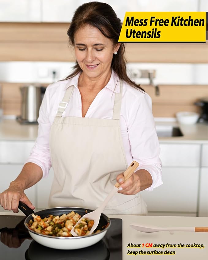 - Thoughtful Design: The little bulge design prevents the silicone head from touching the cooktop after cooking, effectively keeping the surface clean;Wooden handle keeps you away from the trouble of cooking utensils rusting or breaking