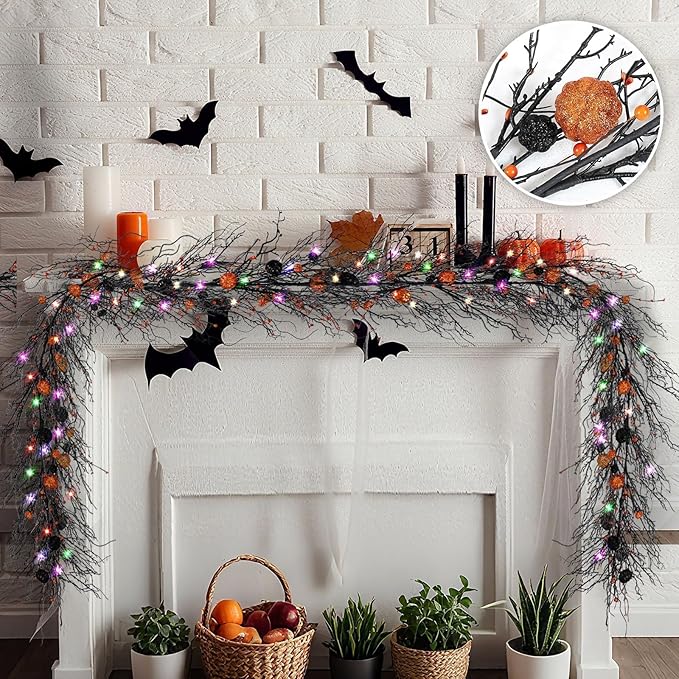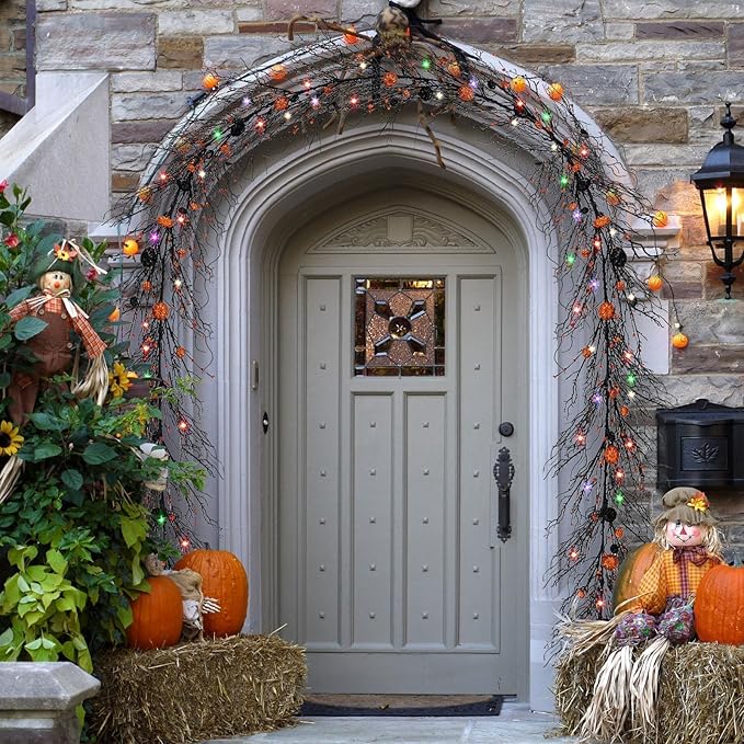 - Halloween Decoration Willow Vine Lights : 9.8 ft long black halloween willow vine twig with 30 LED orange & purple & green & pink lights 2 pcs ,includinng balck & orange pumpkins and berry;The whole garland is full of atmosphere of terror, symbolizing the arrival of halloween, great for the front door, entryway, porch wall, window, and fireplace decor