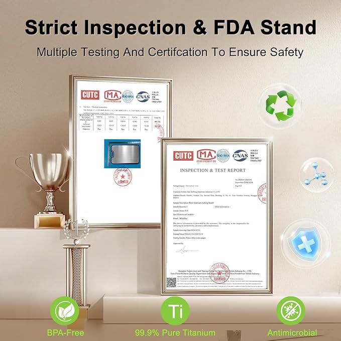 - 【Uncompromising Quality & Durability】 Engineered to outperform traditional cutting boards, our premium titanium surface resists knife marks, repels food residue, and never absorbs odors – ensuring lasting hygiene. The solid titanium construction features a thickened design that withstands rigorous daily use, from heavy chopping to precise slicing, without scratching or retaining food juices. This combination of innovative materials and robust engineering creates the ultimate long-term kitchen investment