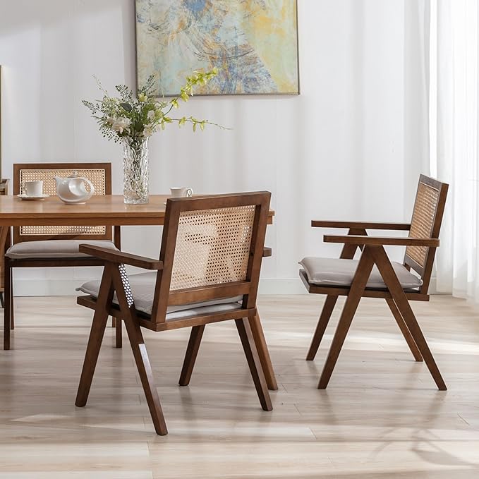 Rattan Dining Chairs Set of 2, Farmhouse Wicker Dining Chairs with Removable Linen Cushion Accent Cane Armchair for Dining Room Kitchen Restaurant, Walnut
