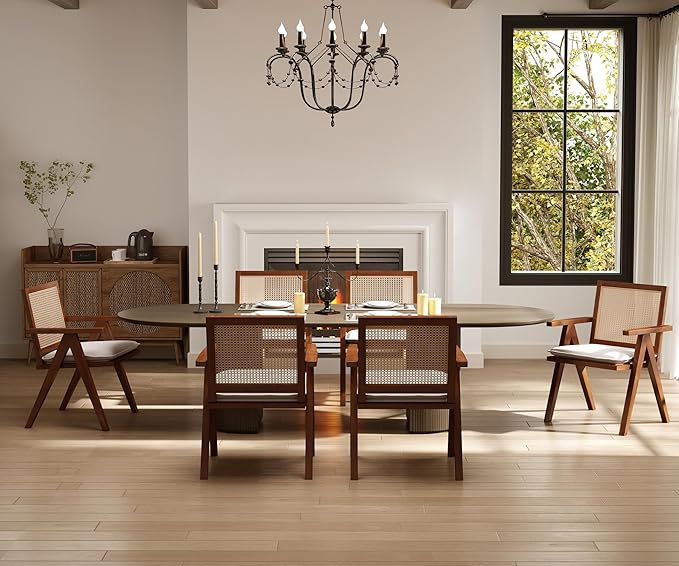 Rattan Dining Chairs Set of 6, Farmhouse Wicker Dining Chairs with Removable Linen Cushion Accent Cane Armchair for Dining Room Kitchen Restaurant, Walnut