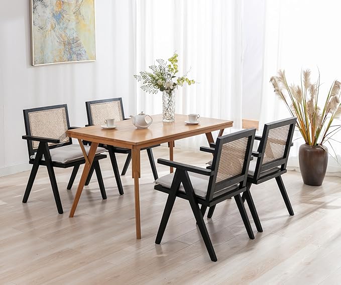 Rattan Dining Chairs Set of 4, Farmhouse Wicker Dining Chairs with Removable Linen Cushion Accent Cane Armchair for Dining Room Kitchen Restaurant, Black