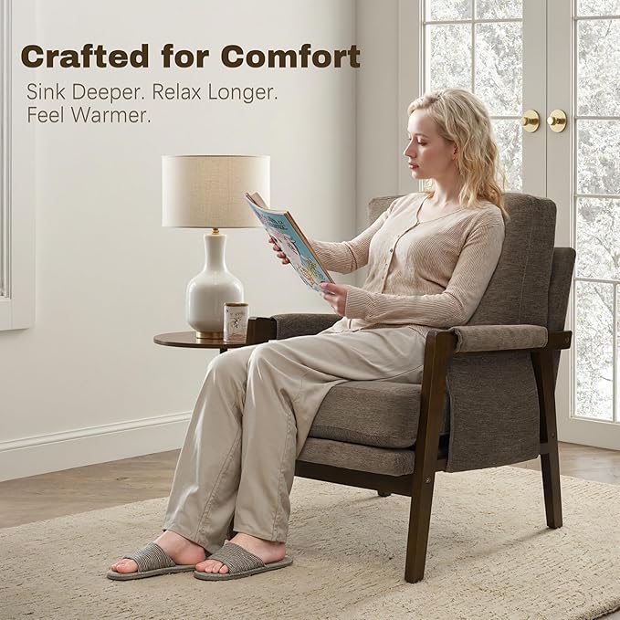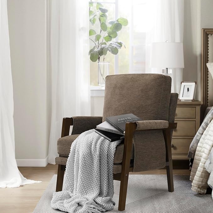 - Please Your Eyes - Designed in a unique mid-century modern style, the curved armrests provide a unique and stylish look, while the solid wood frame and linen fabric add a modern touch. With a sleek and modern design that incorporates retro elements, this accent chair will add a touch of sophistication to any room.