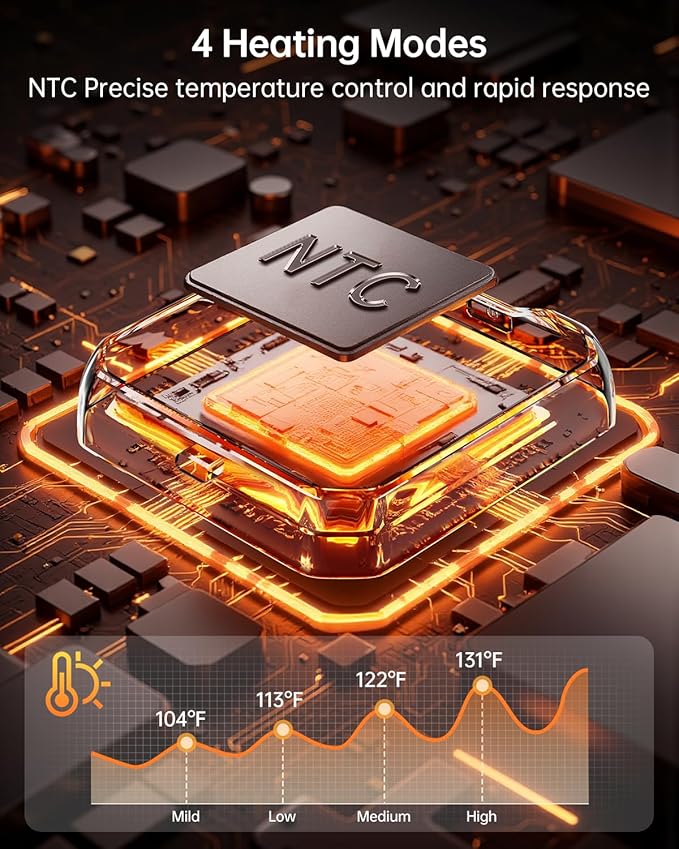 - 【4-Level Temperature Control Heat】The heating pad is equipped with four precise temperature control ranges of 104℉-113℉-122℉-131℉, Heating pad for period cramps is recommended to start with the lowest level when using for the first time and gradually adapt, and avoid direct contact with the skin to prevent burns.
