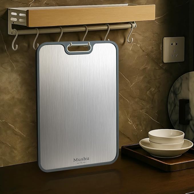 - 【Sleek & Space-Saving Titanium Cutting Board】 Featuring a convenient hanging design, our cutting board keeps your kitchen tidy while adding modern elegance. Its seamless surface ensures quick cleanup, maintaining both style and functionality in your cooking space