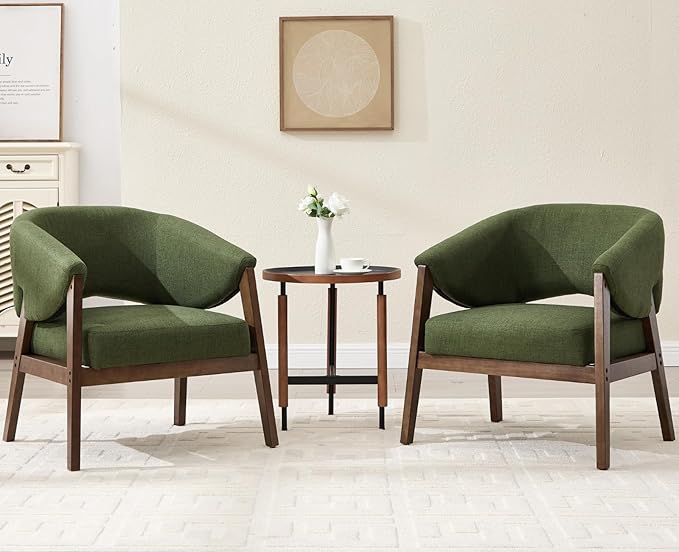 Mid-Century Modern Accent Chairs Set of 2, Comfy Barrel Armchairs with Wide Seat, Upholstered Lounge Chairs with Walnut Wood Legs for Living Room/Bedroom/Reading Corner, Linen Fabric, Deep Green
