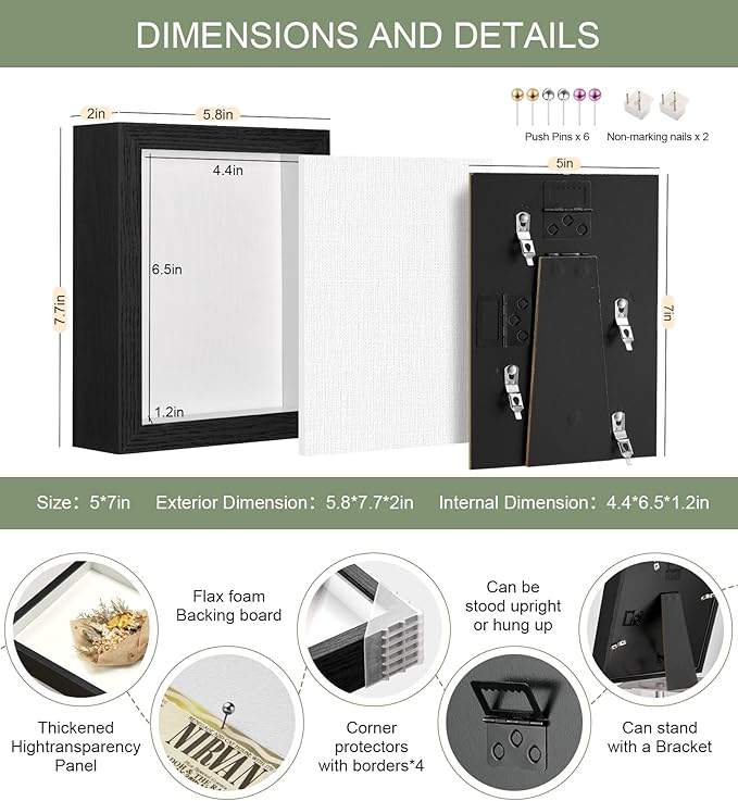 - 【RTZQQIN Shadow Box】This elegant 5x7in shadow box frame features a 0.25in thick white linen backing and 6 push pins,instantly elevating your dried flowers、medals、pets、graduation mementos,and other cherished items into art displays,Effortlessly create your own memory space.