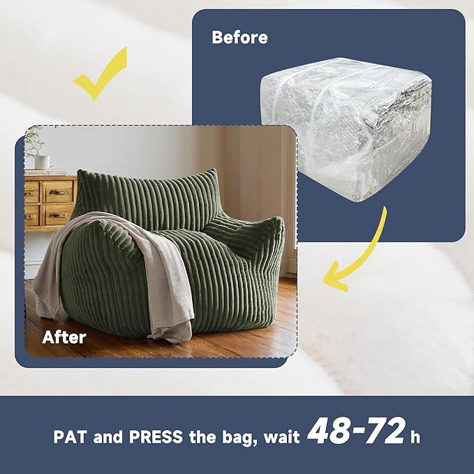 - 【Comfy Bean Bag Couch】: Measuring 46.06"D x 38.58"W x 29.53"H, this versatile furniture serves as both a spacious bean bag chair for adults and a kids bean bag chair. The bean bag sofa requires no assembly—simply allow it to air out for 48-96 hours after unboxing. Firmly pat and fluff to accelerate expansion and restore its full cozy shape.