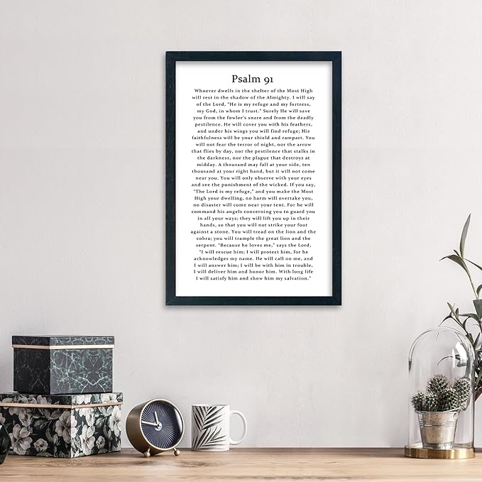 LuZhiQiang Psalm 91 Scripture Wall Art 16"×11" Bible Verse Christian Inspirational Sign Wood Framed Wall Hanging Decor (Black)
