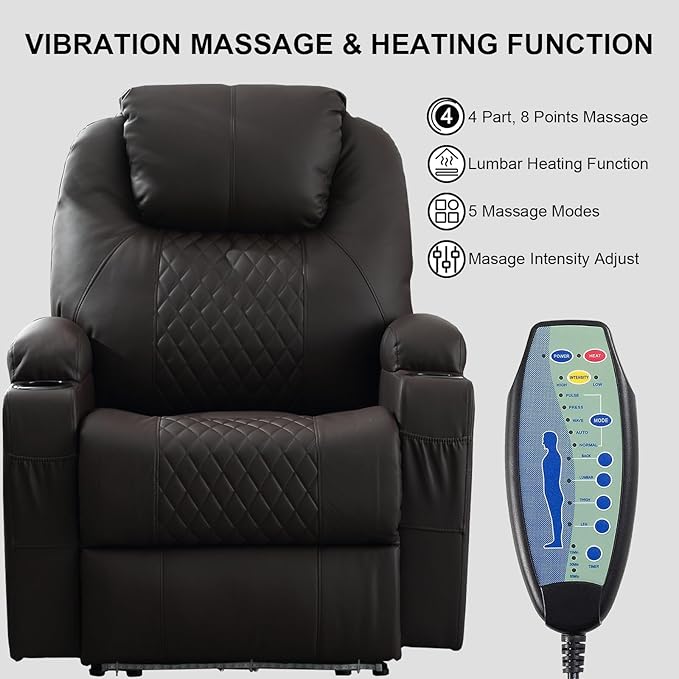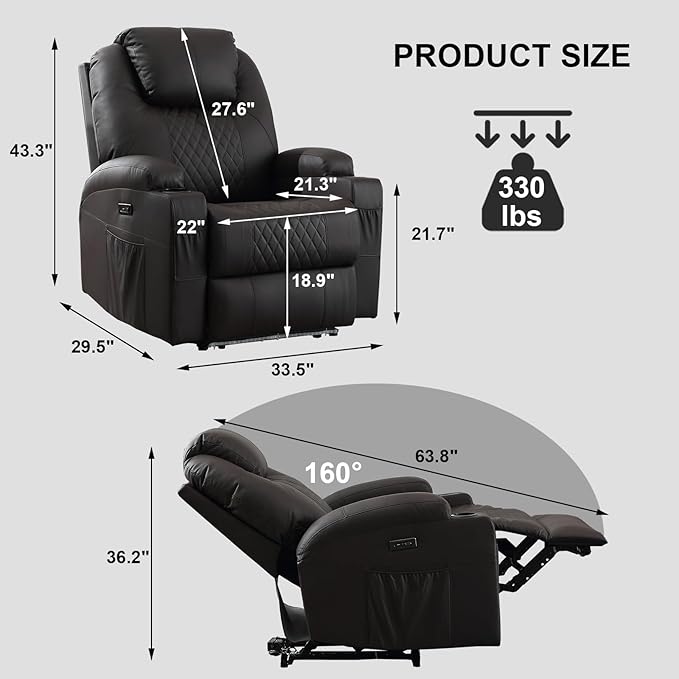- Massage Heat Functions: This chair set up multiple vibration massage points and added a heated function on the lumbar, which can easily massage your back, waist, thighs, legs. Our recliner will definitely bring you more warm and comfortable in the cold winter experience