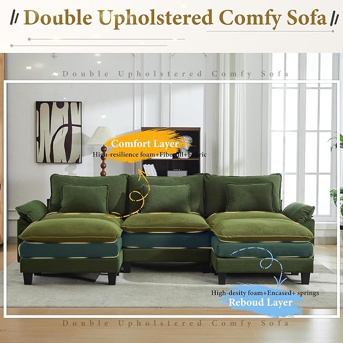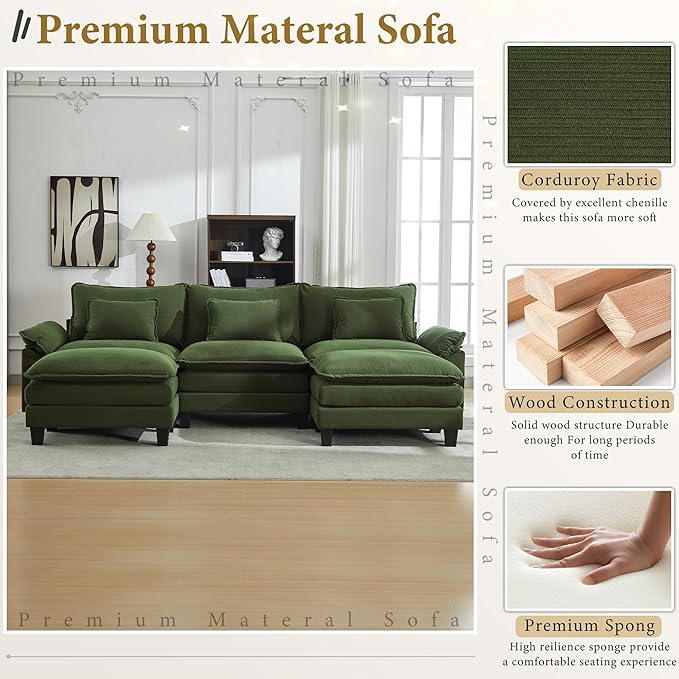 URRED Modular Sectional Sofa Comfy Cloud Couch, Modern Corduroy Sofa Sleeper Deep Seat Couches with Ottoman/Pillows for Living Room (Green, 117'' - U Shape)