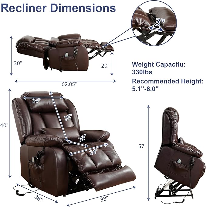 - [Upgraded Massage and Heating] The power lift recliner is equipped with 8 vibration nodes targeting the back, lower back, thighs and legs. There are also 5 vibration massage modes and 3 intensity options. You can enjoy a personalized full body massage experience at home. The lumbar heating function helps reduce fatigue by reducing pressure and improving blood circulation in the lower back.