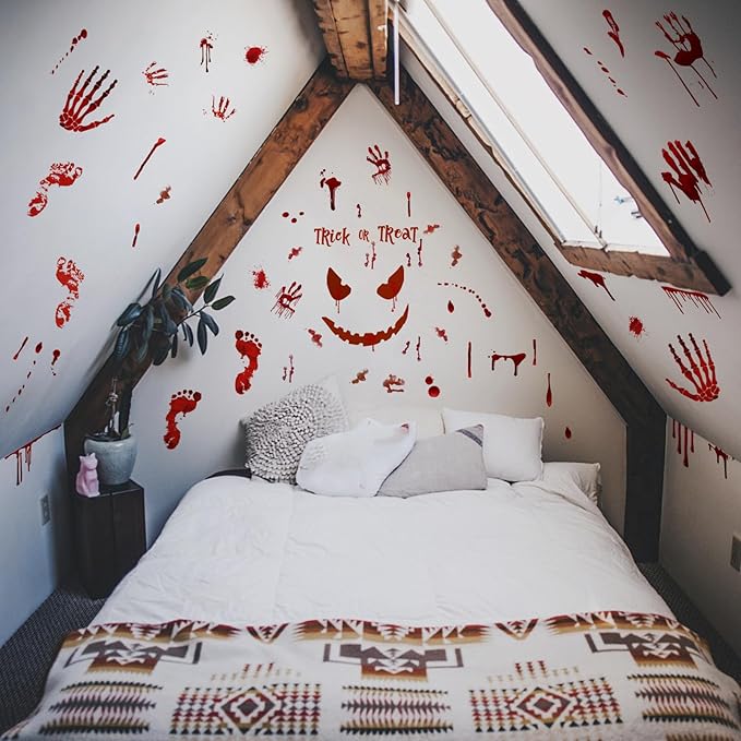 - Ideal Bloody Halloween Party Decorations :These scary bloody handprints footprints stickers blend well into the bathroom, kitchen, door, windows, doorway, car, floor, inside, indoor or outdoor. Create a creepy entrance to your Halloween party or haunted house stoop is simple with these Handprint and Footprint Decals.Design them as your idea, turn your home into a haunted house instantly. Get creative to decorate a unique Halloween now!