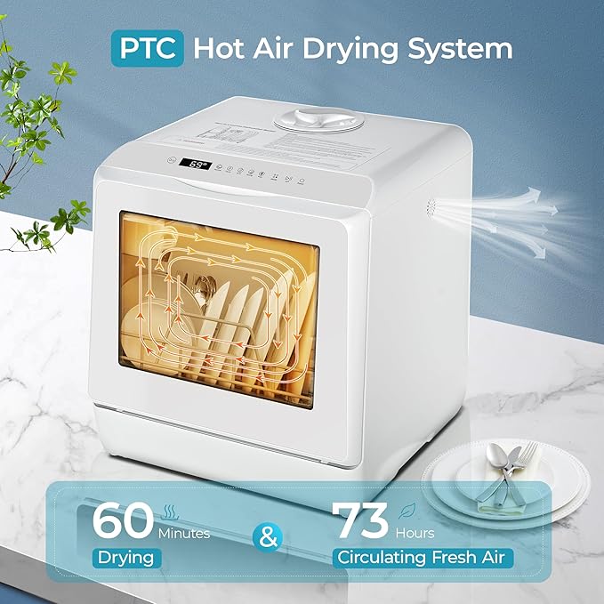 - 𝐄𝐧𝐡𝐚𝐧𝐜𝐞𝐝 𝐃𝐫𝐲𝐢𝐧𝐠 𝐅𝐮𝐧𝐜𝐭𝐢𝐨𝐧: Equipped with a advanced drying mode, Euhomy compact dishwasher delivers 60 minutes of hot air drying followed by 73 hours of automatic ventilation. Get clean, dry, odor-free dishes every time. The drying mode fits any wash cycle (except Fruit mode) and can even run solo for quick refresh. *𝐏𝐥𝐞𝐚𝐬𝐞 𝐍𝐨𝐭𝐞: Please use the detergent specifically designed for washing dishes