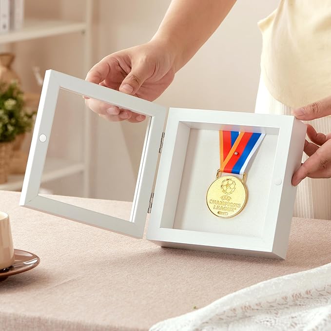 - 【Wall-mountable or freestanding】① The shadow box frame 5x5 back panel features two non-slip serrated hooks (includes two residue-free adhesive pads) for secure wall mounting in offices, living rooms, or bedrooms. ② It can also stand upright on desks, easels, work surfaces, or any tabletop—not just a frame, but a curator for your personal legacy museum.