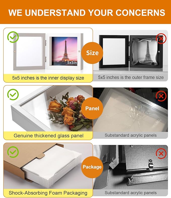 - 【Thickened Genuine Glass Panel】The deep shadow box frame features a thickened polished glass panel with 40% enhanced light transmission. Each glass panel is reinforced with impact-resistant bubble wrap, significantly reducing the risk of scratches or breakage. Don't let cheap acrylic panels ruin your precious moments.