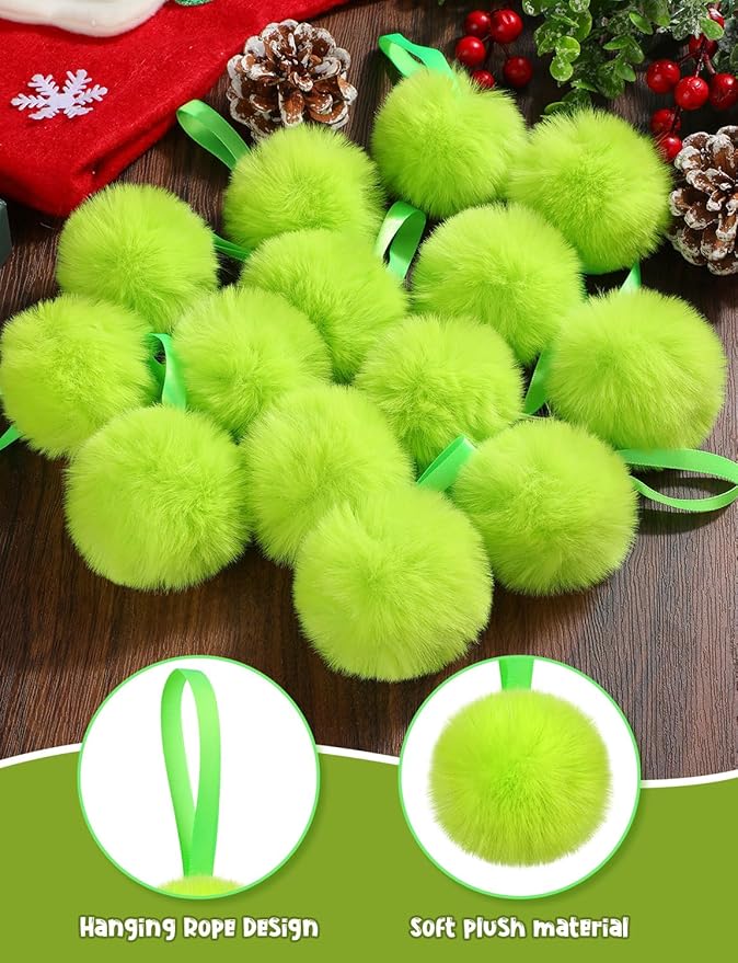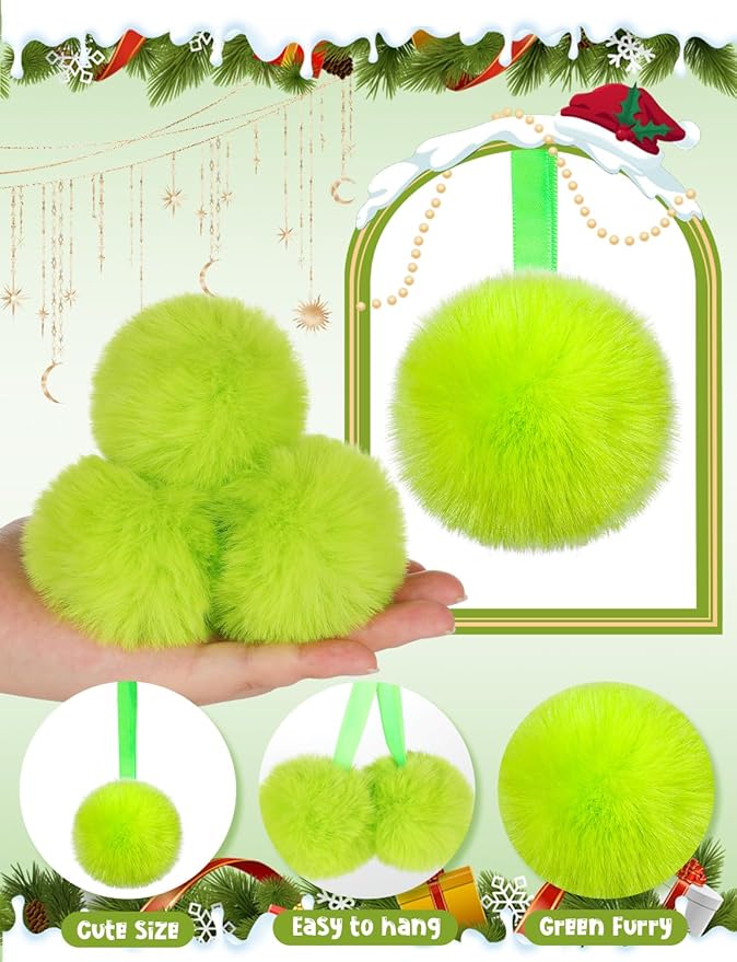 - OUTSTANDING DESIGN: These grinch ornaments balls have a fashionable furry style. They are all the rage as Christmas adornments, they're not only trendy but also irresistibly cute and classically Christmas, which can make your Christmas decor stand out