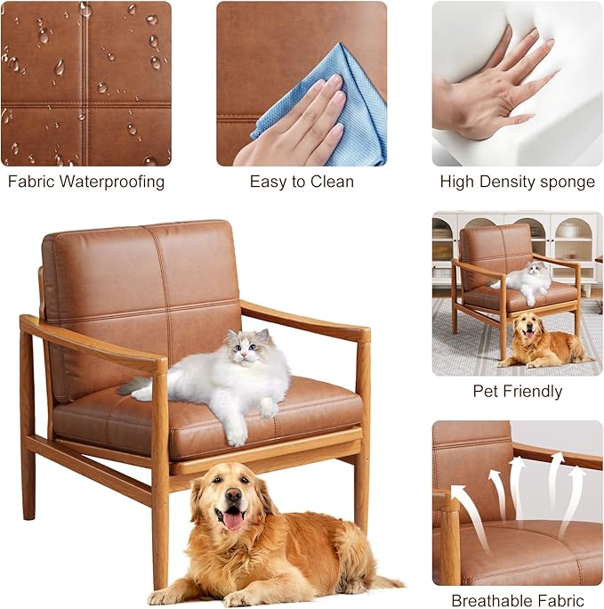 Mid Century Modern Accent Chair Set of 2, Leather Accent Chair, Relaxing Armchair with Solid Wood Frame & Soft Cushion, Reading Leisure Chairs for Living Room