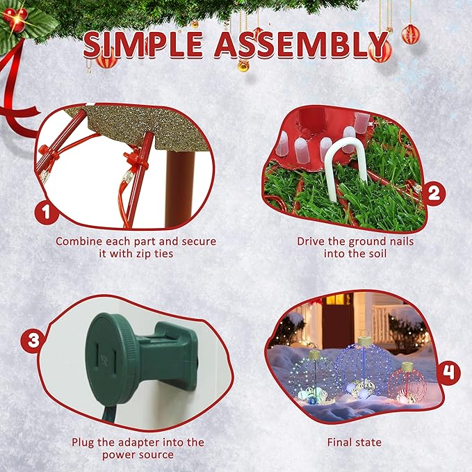 - Simple Assembly: Turn these ornaments from parts to patio ready in minutes: Step 1: Connect pieces zip tie them up tight. Step 2: Slam ground nails into dirt or snow they anchor like a pro. Step 3: Plug the adapter in no wiring headaches just instant power. Step 4: Boom! Festive lights shine bright like Santa’s workshop landed in your yard. No DIY skills? No problem. Even first timers nail this setup