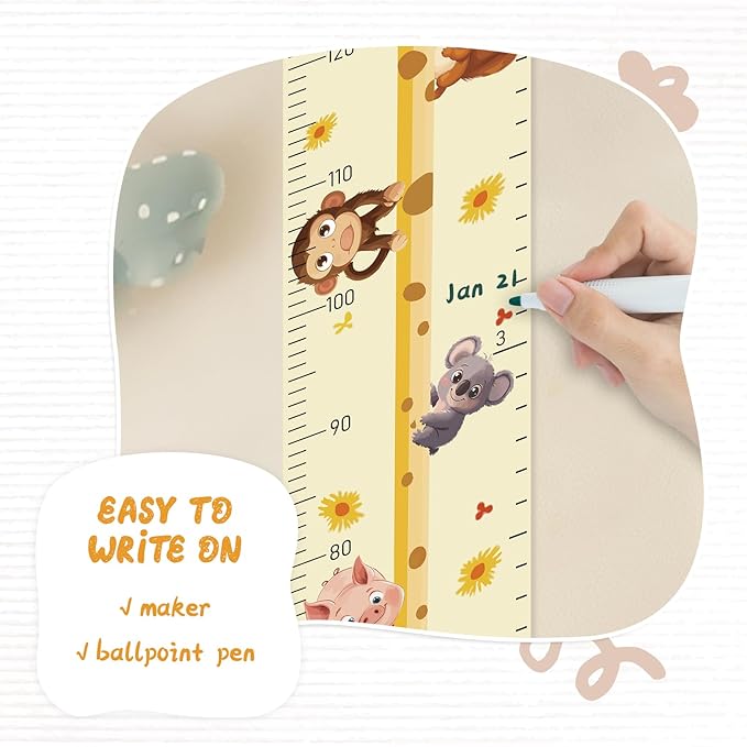 - Design: Kids growth chart with rope at the top of the chart, easy to install and removeable, foldable and portable design, easy to store, hang, roll up, transport, and save space. It boasts a material that's easy to write on, where you can use dark colored ballpoint pens and markers to track growth milestones.