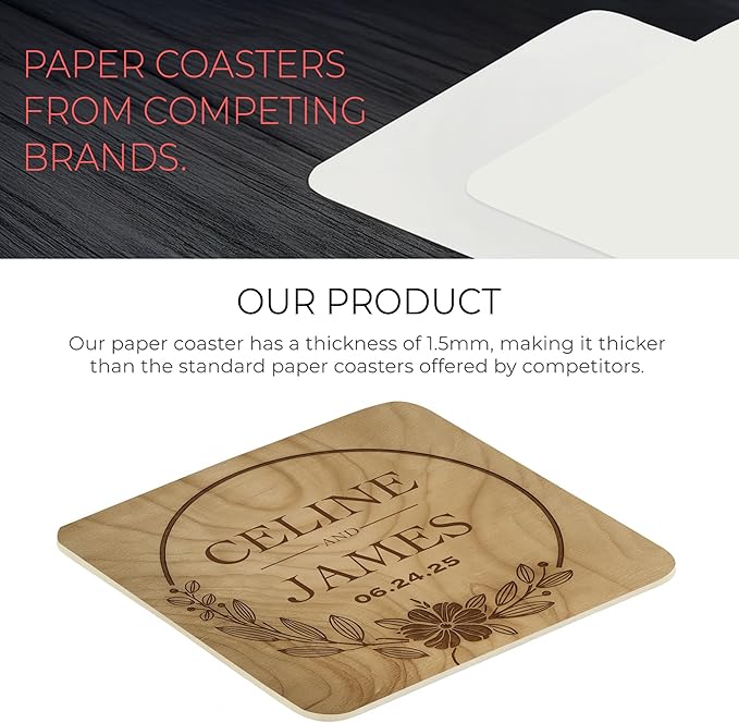 - PREMIUM QUALITY – Made from high-quality cardboard material, our wedding coasters are extra-thick at 1.5mm, providing superior durability and absorbency compared to thinner options. The 4"x4" square size offers the perfect blend of sturdiness and practicality, ensuring long-lasting use throughout your celebration.