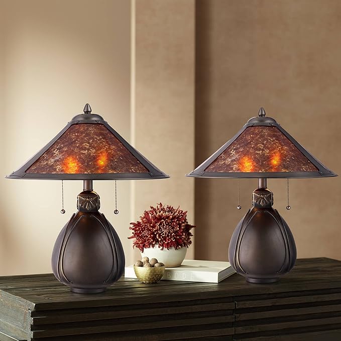 Robert Louis Tiffany Nell Rustic Mission Tiffany Style Accent Table Lamps 19" High Set of 2 Bronze Brown Antique Pottery Natural Mica Shade Decor for Bedroom House Bedside Nightstand Home Office