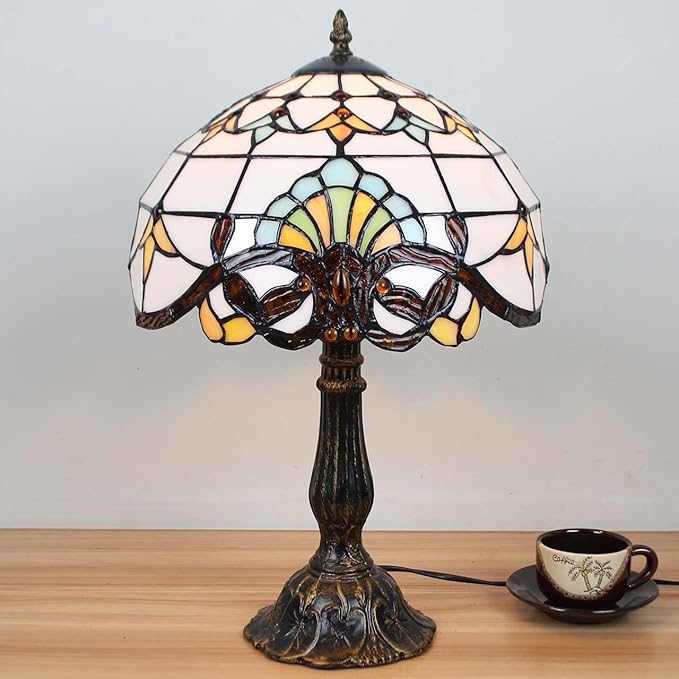 Bieye L10641 Baroque Tiffany Style Stained Glass Table Lamp Night Light with 12 inches Wide Lampshade Metal Base for Bedside Living Room Bedroom, Brown, 18-inch Tall
