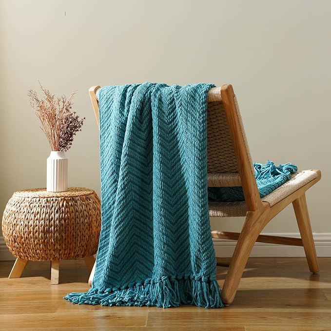 BATTILO HOME Teal Throw Blanket for Couch, Knit Woven Turquoise Blanket Versatile for Chair, Super Soft Warm Decorative Blanket with Tassels for Bed, Sofa and Living Room, 60" x 80"