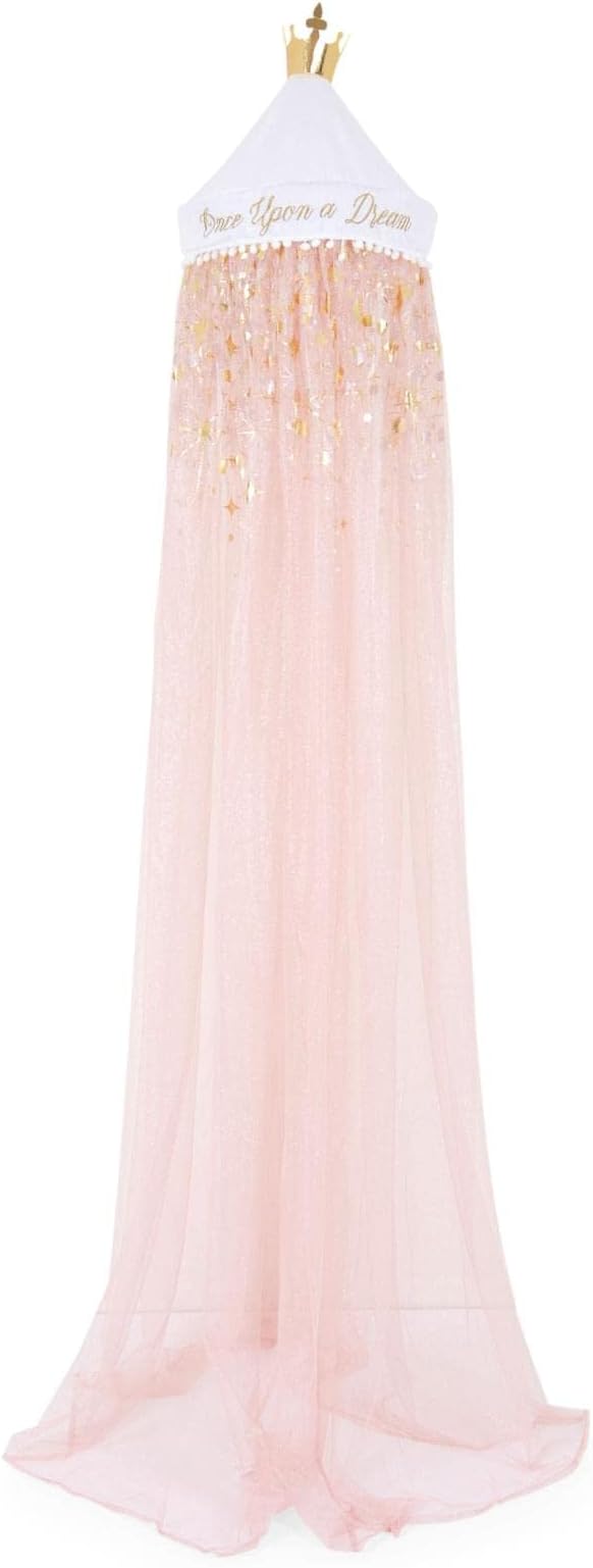 - Whimsical Style Fit For Royalty: The top of the bed canopy is adorned with a gold crown, white pompoms, and the quote "Once Upon a Dream" in gold lettering. Made from sheer pink netting spangled with gold sparky designs.