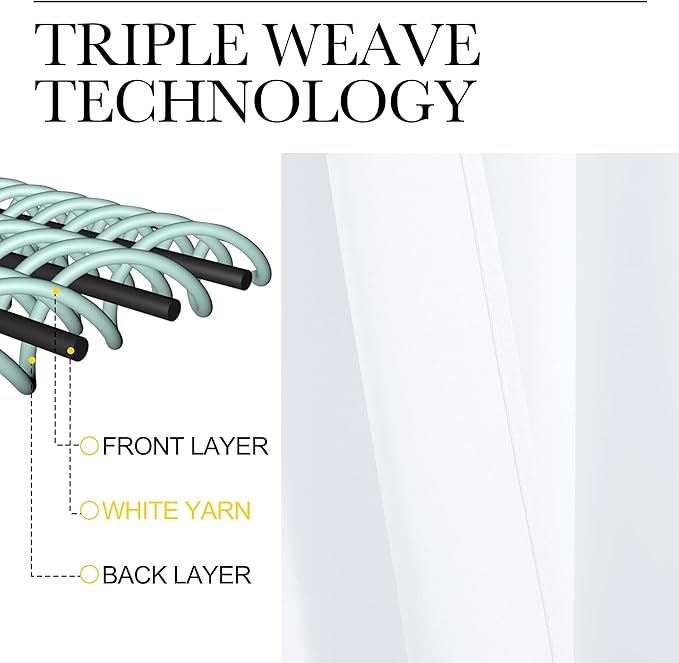 - REAL WHITE: This curtain adopts triple weave technology. Unlike other curtains where the middle layer is black, the middle layer in this curtain is white yarn. So you don't have to worry that white has impurity.