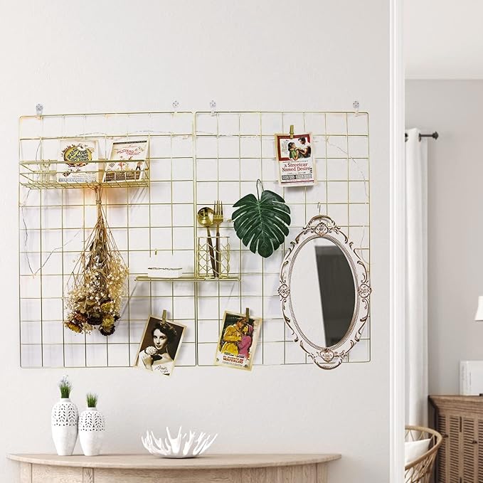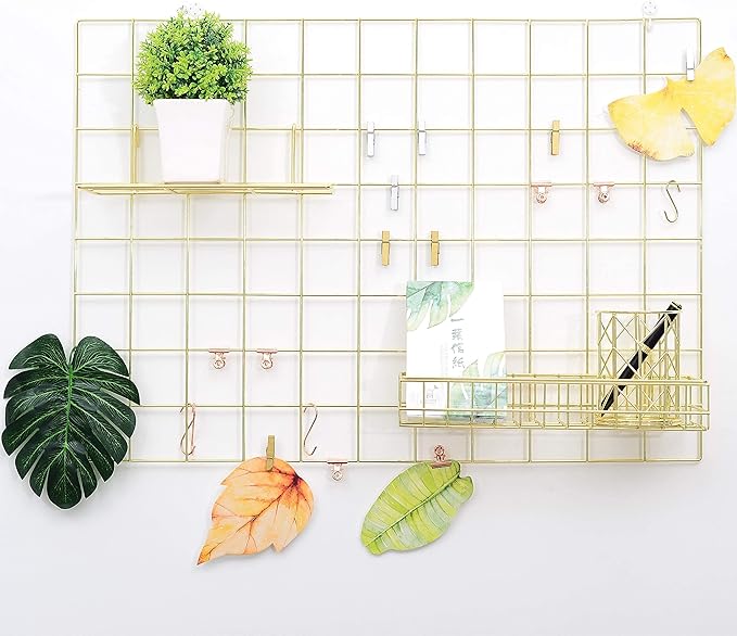 - ❀Multifunctional: you can add some shelf on the memo board clip grid, then place some small items in the shelf, such as keys, notes, books and children's toys or other daily necessities;This grid wall can be used in many occasions, such as home, living room, study, bathroom, bedroom, office, conference room, coffee shop, which can add beauty to your space