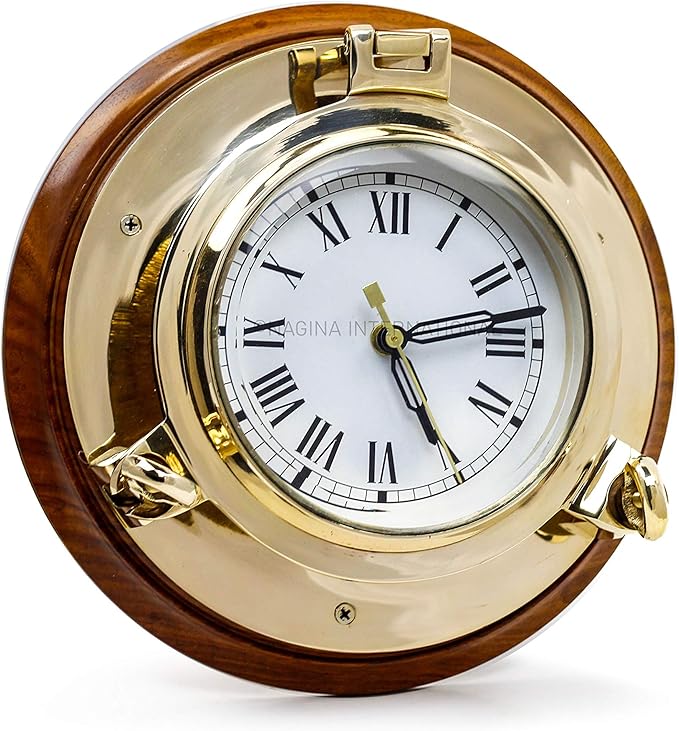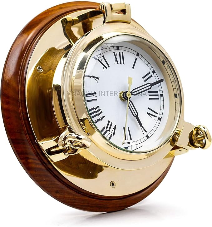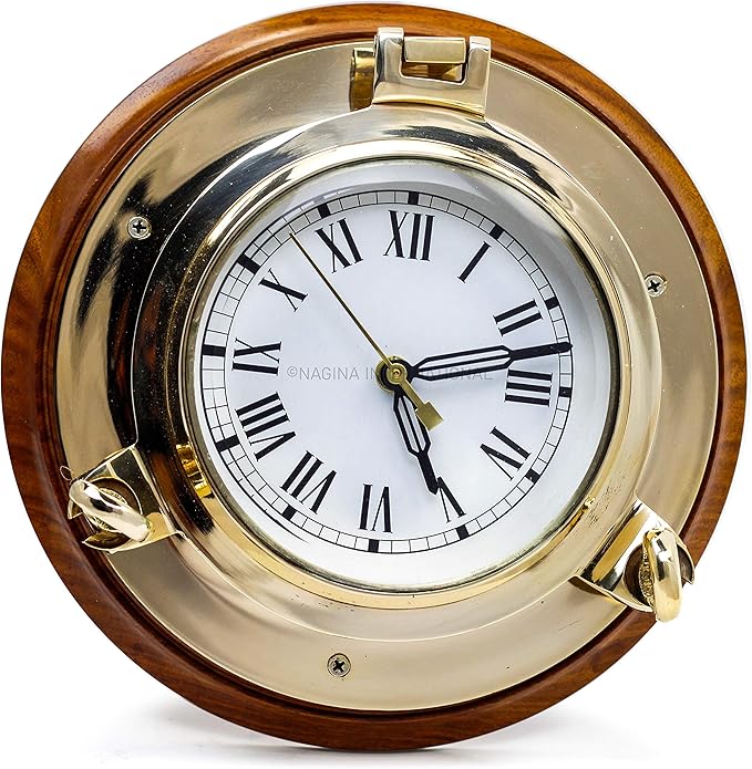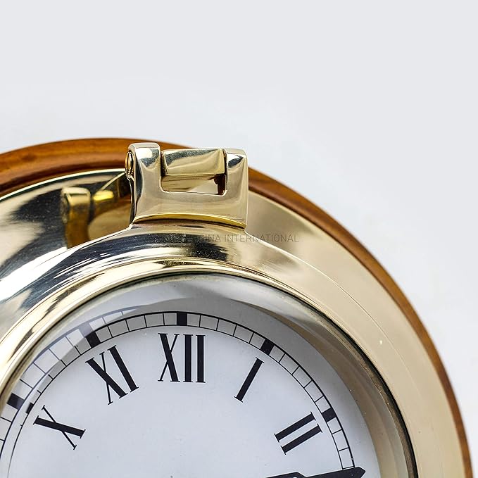 Nagina International Large Nautical Authentic Brass Porthole Clock On Wooden Rosewood Mount | Excellent Quality Nautical Decor for Real Navals (10 Inches)