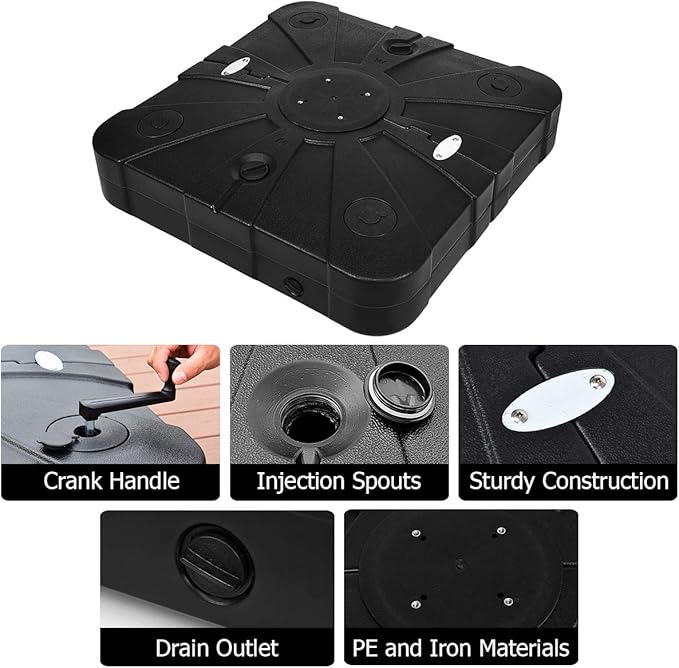- Stable Weight of 260 LBS:This base weight can provide stable support for cantilever umbrella and offset umbrella. With just water, it weighs 220 pounds. But the base can weigh up to 260 pounds when wet sand is added. Even in heavy windy conditions, your umbrella can be firmly fixed in place without tipping over.