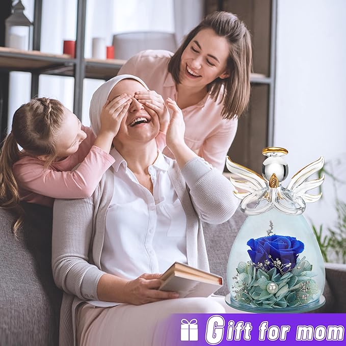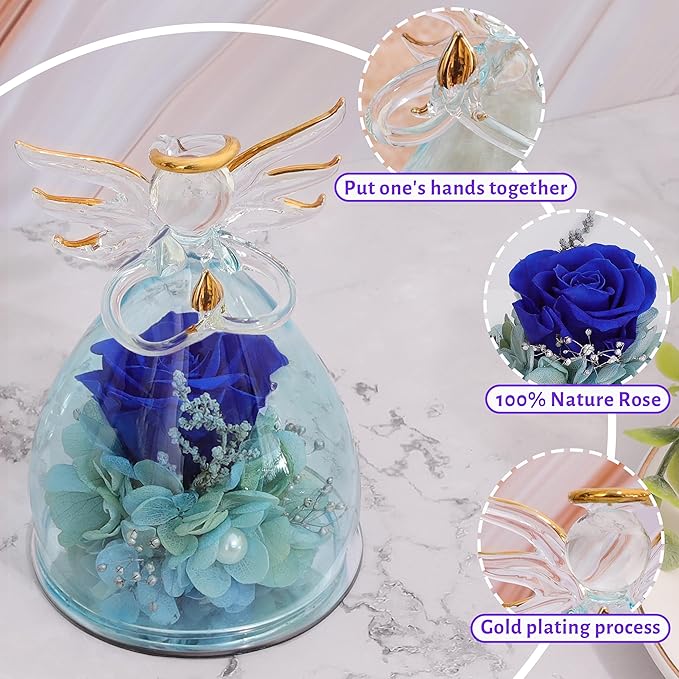 ANLUNOB Preserved Rose Birthday Gifts for Women Mom Grandma Wife, Glass Angel Figurines Gifts with Pretty Dark Blue Flowers for Anniversary Wedding