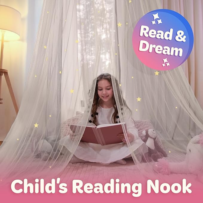 - SAFE, FUNCTIONAL, VERSATILE: 100% polyester (a flame-retardant material) with 156 mesh holes per sq in—this netting is still providing air flow and circulation for your little princess. The stars are applied to the net using advanced thermal printing technology, which secures the stars from ever falling off. For best fit, use on a twin- or full-size bed. It also makes for an enchanting child’s reading nook hideaway in their bedroom or playroom!