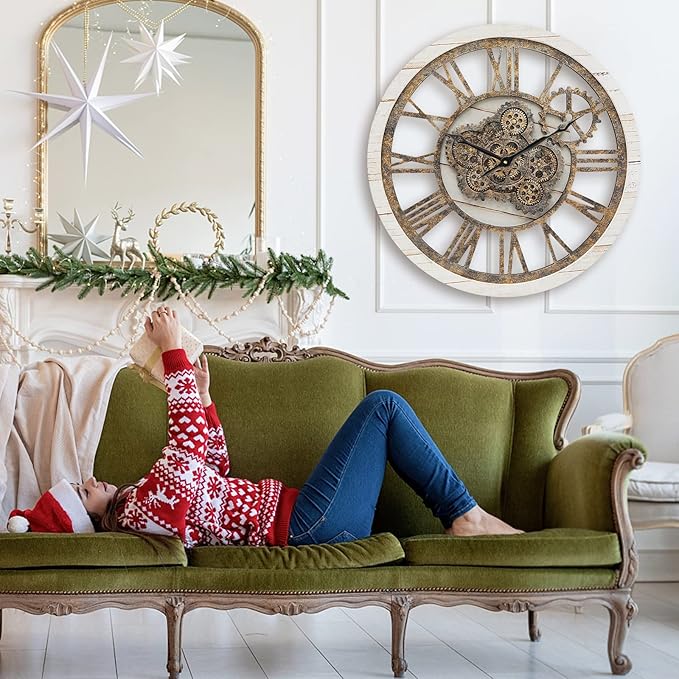 HOIBAI Large Wall Clock, Wall Clocks for Living Room Decor 20 Inch Farmhouse Vintage Rustic Kitchen Wall Decor Vintage Roman Oversized Wall Clock for Home Bedroom House Office, Moving Gears Clock
