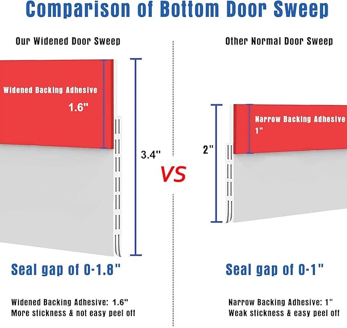 - ✔FIX HUGE GAP - Our door sweep whole size is 3.4” W x 39”L, the red adhesive back size is 1.6” W x 39" L,which is much wider than normal one, can perfectly seal the huge gap of 0 to 1.8”.Don't worry about the gap more than 1 inch any more.