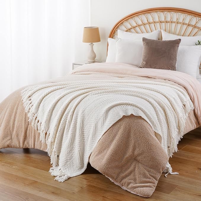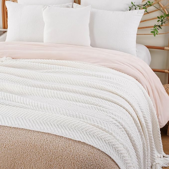 BATTILO HOME Cream Throw Blanket for Couch, Textured Knitted Throw Blanket with Tassels, Couch Cover Blanket Warm Decorative White Throw Blankets for Sofa Living Room, 60" x 80"