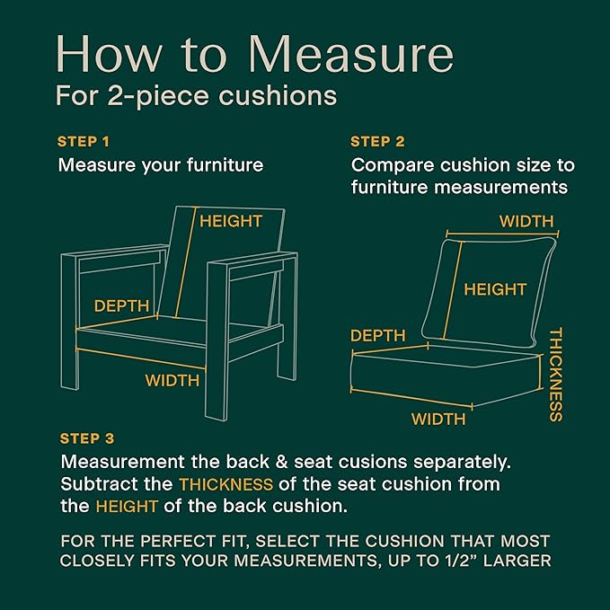 - Effortless Care – Keep your outdoor living space looking guest-ready all season long with our low-maintenance deep seating cushion set for patio furniture. Easily spot clean using a rag, soap, and warm water. Hang cushion and let air dry for best result.