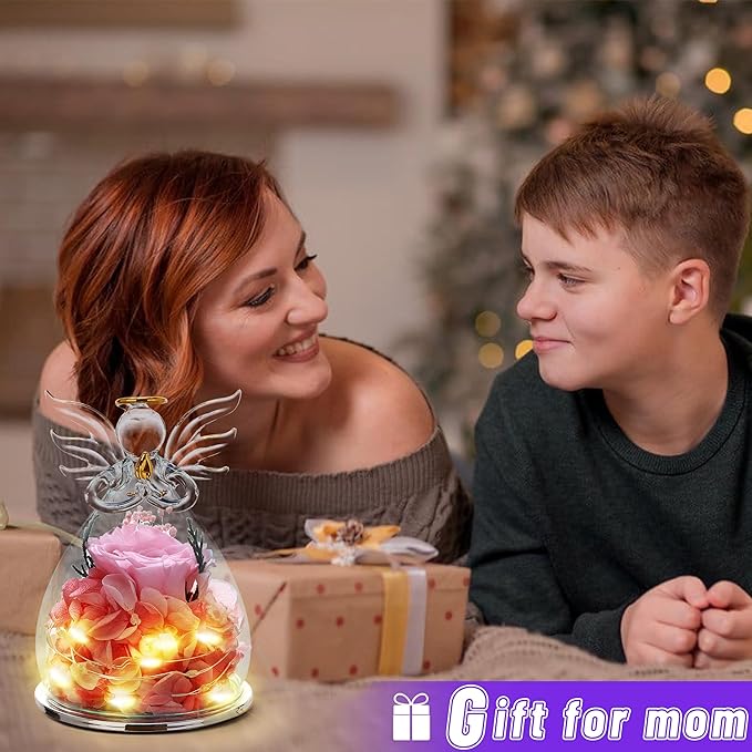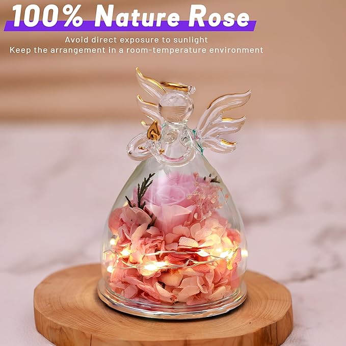 ANLUNOB Preserved Flowers Rose Birthday Gifts for Women, Angels with Pretty Pink Roses for Wedding
