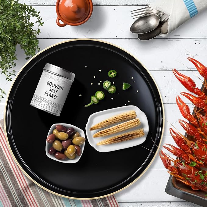 Black Round Decorative Tray with Handles, 13" Versatile Serving Tray for Coffee Table, Ottoman, Ideal for Serving, Displaying, Organizing