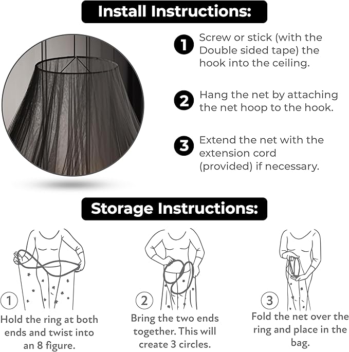 - EFFORTLESS INSTALLATION IN 3 SIMPLE STEPS: Experience quick setup with our user-friendly canopy. Screw or stick the hook into the ceiling, effortlessly hang the net, and extend it using the provided extension cord for instant elegance.